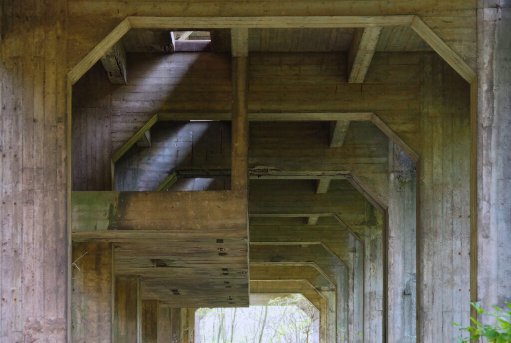 Während an jeder Ecke die Auslöser klicken, gehts für mich aus dem Gebäude heraus – ich muss mich mal ein wenig in der Sonne aufwärmen. Im sanften surren der Drohne versuche ich die Fassade fotografisch zu erfassen und werde von leuchtenden Hagebutten, Blüten und der schönen Struktur des natürlichen Waldes abgelenkt. Bei einer kurzen Trinkpause gesellen sich Fotofreunde zu mir und wir fangen auch an, über Aufnahmetechniken, Kameraeinstellungen und Tipps und Tricks zu sprechen. Gemeinsam werden Versuche mit Zieher-Bildern (ICM – intentional camera movement) gemacht, Erfolge gefeiert und spannende Ecken im Gebäude ausgetauscht und schon zerstreuen wir uns wieder.