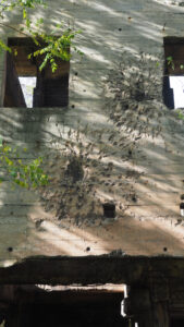 Auf dem Gelände angekommen parken wir unsere Autos auf einem Fahrweg im hohen Gras. Gigantisch, mit deutlichen Einschußlöchern ragen die beiden Schornsteine aus dem Wald, auch die Stahlbeton-Skelette der Haupthäuser sind zu sehen.