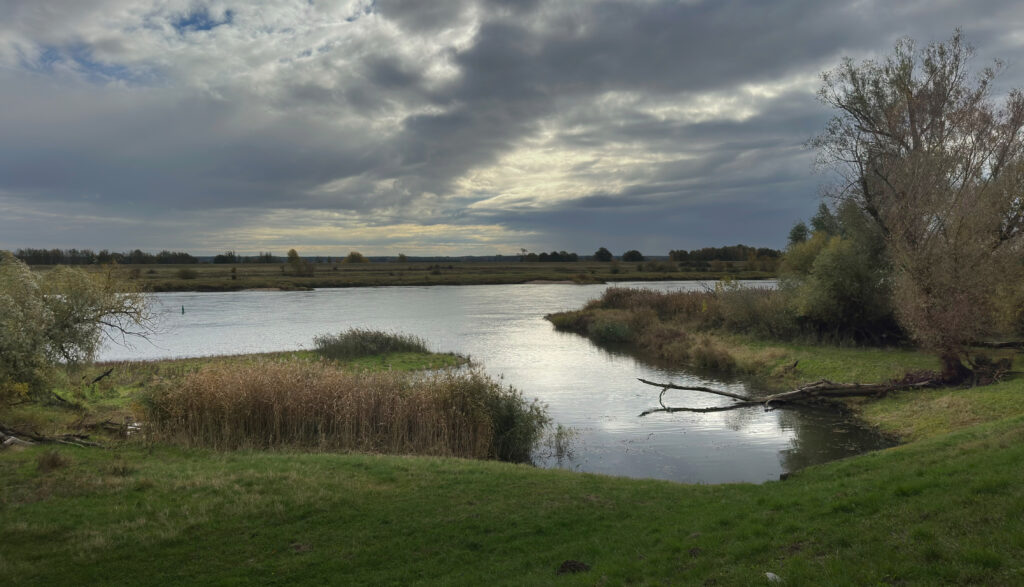 Mit nunmehr dreckigen Knien, mit Ruß verschmutzten Händen zieht es uns dann langsam in Richtung Oder-Damm, wieder, um sich aufzuwärmen, aber auch, um gute Standorte für Außenaufnahmen zu suchen. Während die einen es sich auf einer Bank gemütlich machen und etwas essen, entdecken andere einen roten Milan, Adler, Kormorane oder Graureier über der Oder. Die Teleobjektive kommen nun auch zum Einsatz. Rufe wie „Hier ist einer“ und „Da auch!“ führen zu einer schön zu beobachtenden Choreografie …